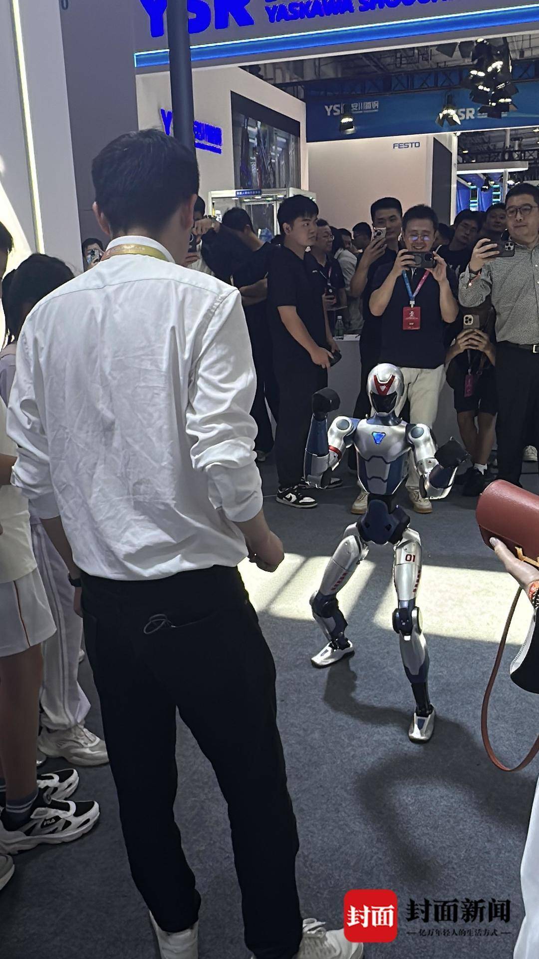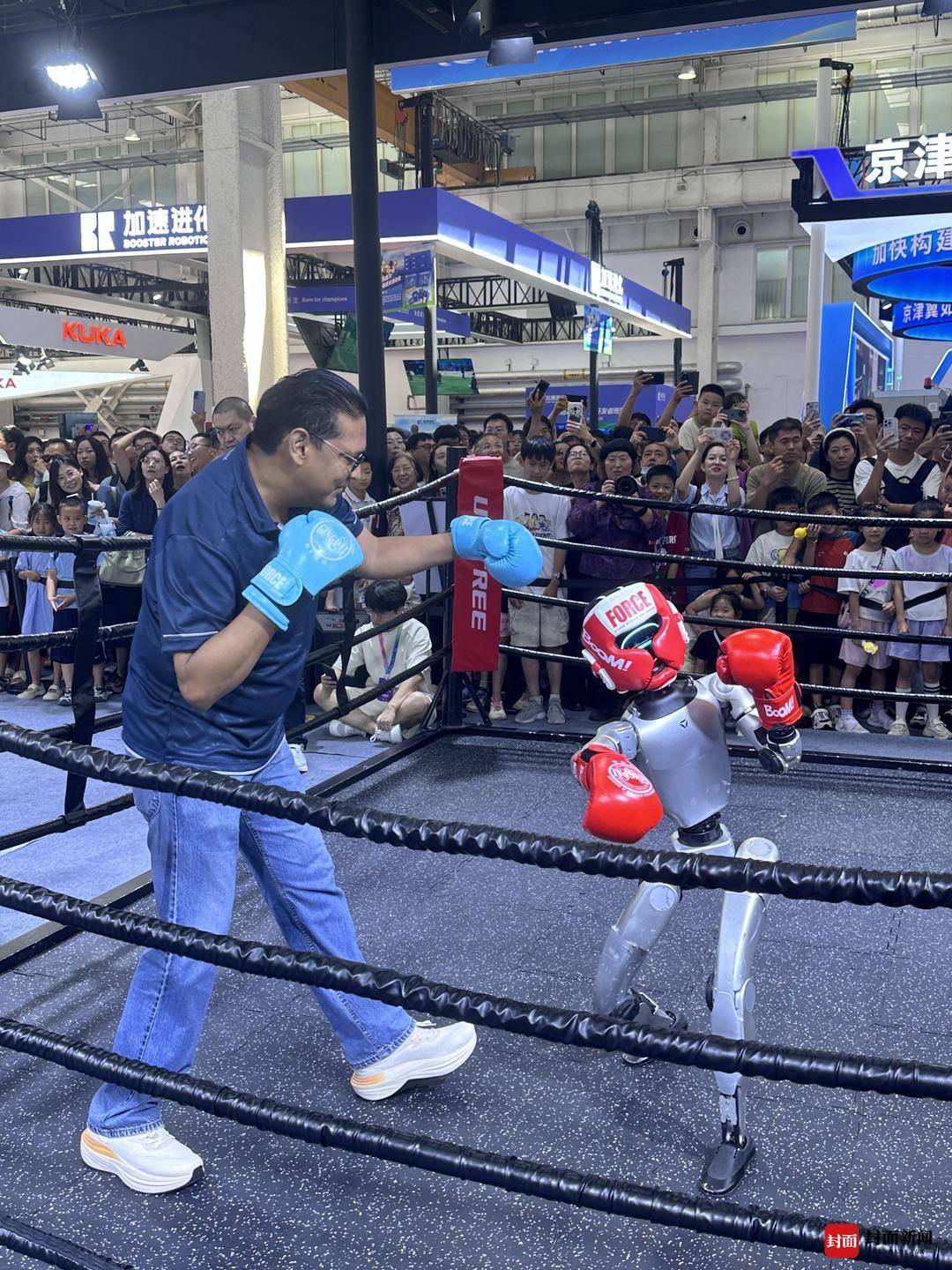 宇树科技机器人与参观者拳击比赛(封面新闻记者边雪拍摄)