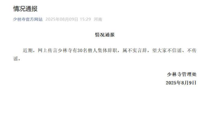 转自:中国新闻网 中新网8月9日电 据少林寺官方网站消息,少林寺管理处9日发布情况通报称,近期,网上传言少林寺有30名僧人集体辞职,属不实言辞,望大家不信谣、不传谣。 图片来源:少林寺官方网站 海量资讯、精准解读,尽在新浪财经APP