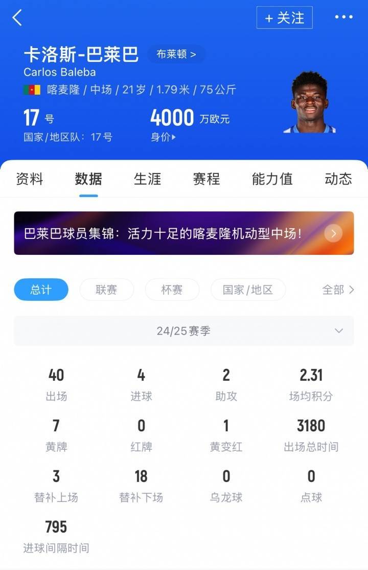 巴莱巴上赛季各赛事为布莱顿出场40次,贡献4球2助,这位21岁的喀麦隆中场目前德转身价为4000万欧元。