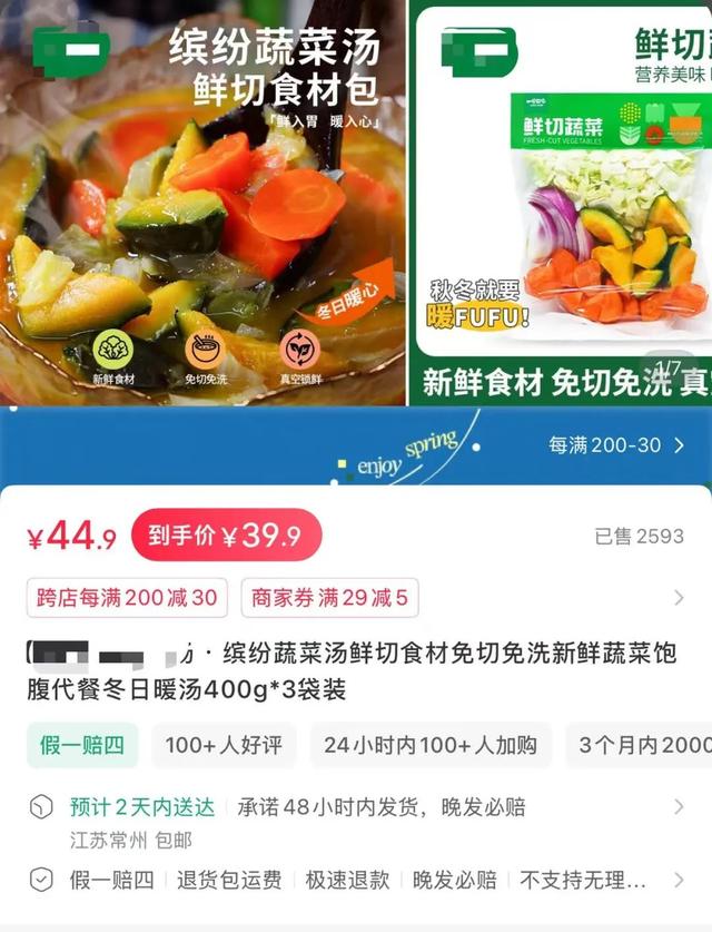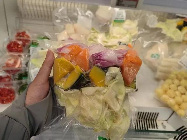这款爆火的“哈佛蔬菜汤”其实本质上就是净菜(也称新鲜消毒蔬菜,是将新采摘的蔬菜经过整理、洗涤、消毒等加工操作,在无菌环境中真空包装而成的一种产品),里面有胡萝卜、南瓜、卷心菜和红洋葱,一共400g重,需要放在冰箱冷藏,售价9元多。