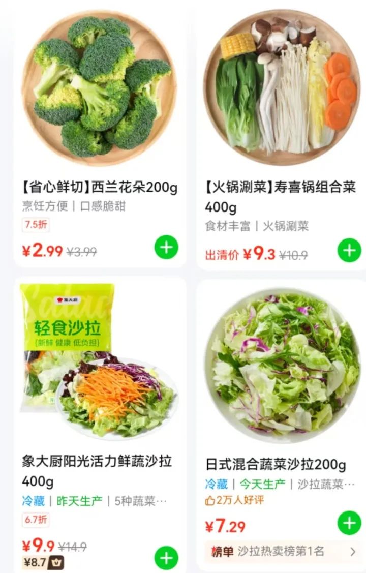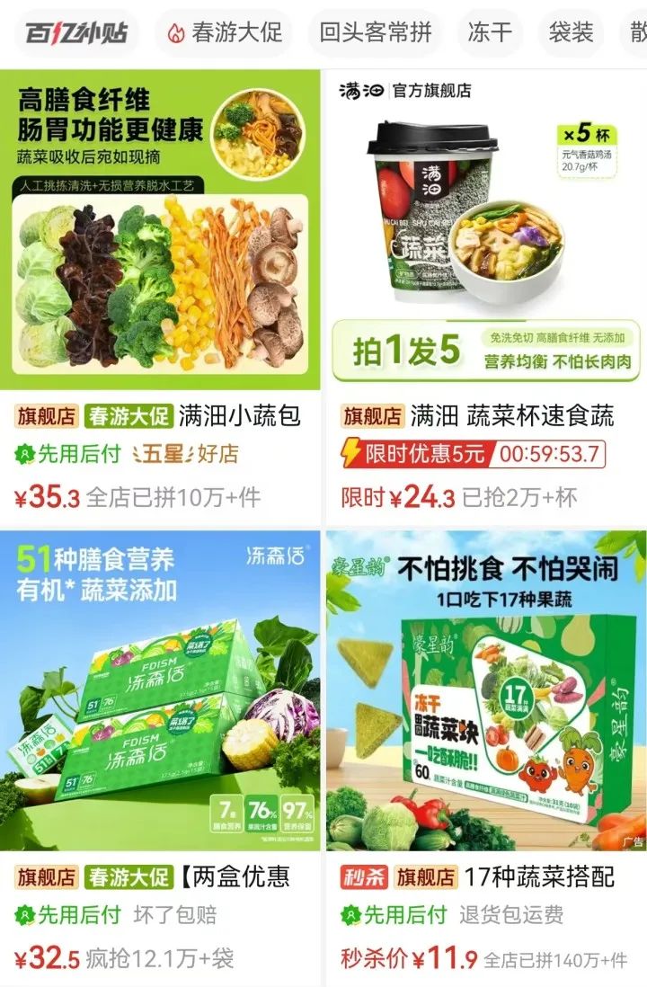 另外,在电商平台上,除了常见的新鲜净菜组合,各种脱水、冻干类的蔬菜块、冻干蔬菜杯销量动辄过万,尤其是冻干蔬菜杯,用开水泡一泡就能吃,变成了不少减肥人士的“代餐”。