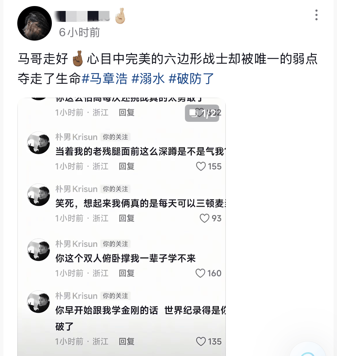 除此之外,他还有多条留言,皆是怀念马章浩的一些别人学不来的健身技能。另外,朴男的视频账号头条已经成为黑白色,这一切的一切好像都证实了这一噩耗。