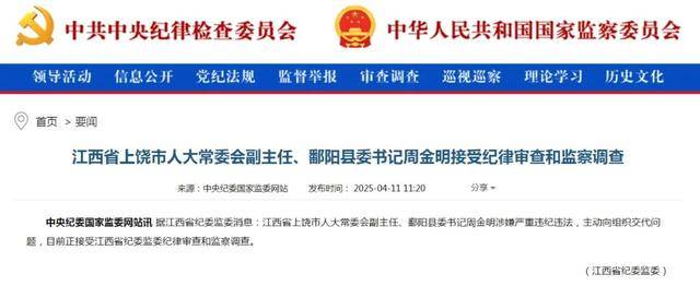 4月11日,江西省纪委监委消息:江西省上饶市人大常委会副主任、鄱阳县委书记周金明涉嫌严重违纪违法,主动向组织交代问题,目前正接受江西省纪委监委纪律审查和监察调查。