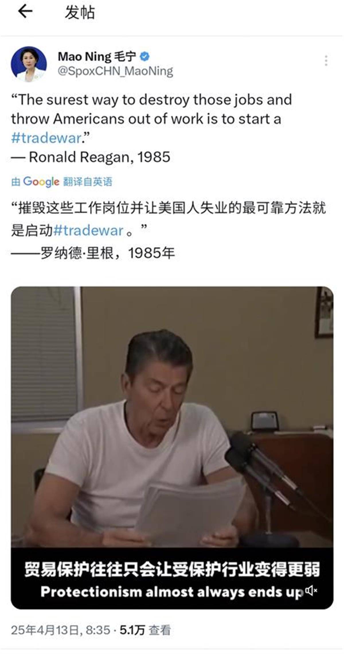 另据环球网此前报道,美国滥施关税引发多方强烈反对之际,当地时间4月7日,中国驻美国大使馆在社交平台X上转发来自中国外交部发言人毛宁的视频,里面援引了美国前总统里根1987年批评关税政策的一段讲话。