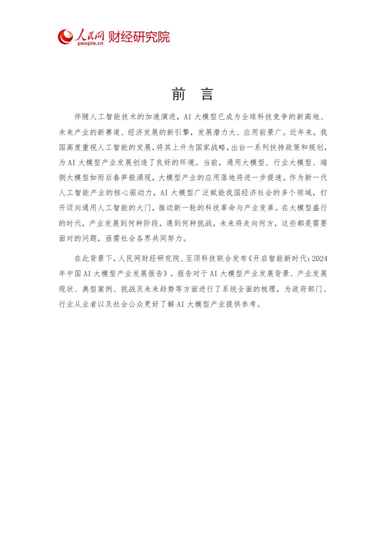 当前,通用大模型、行业大模型、端侧大模型如雨后春笋般涌现,大模型产业的应用落地将进一步提速。作为新一代人工智能产业的核心驱动力,AI 大模型广泛赋能我国经济社会的多个领域,打开迈向通用人工智能的大门,推动新一轮的科技革命与产业变革。在大模型盛行的时代,产业发展到何种阶段,遇到何种挑战,未来将走向何方,这些都是需要面对的问题,亟需社会各界共同努力。