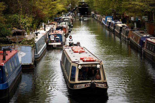 4月18日,人们在英国伦敦的摄政运河上乘船游览。 新华社/法新