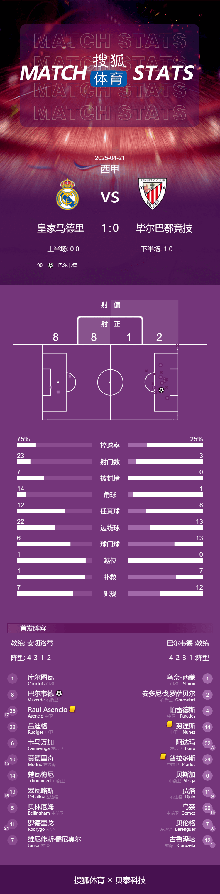 皇马:1-库尔图瓦、8-巴尔韦德、35-劳尔-阿森西奥、22-吕迪格、6-卡马文加、10-莫德里奇(78’15-居勒尔)、14-琼阿梅尼、19-塞巴略斯(58’16-恩德里克)、5-贝林厄姆、11-罗德里戈(78’21-迪亚斯)、7-维尼修斯