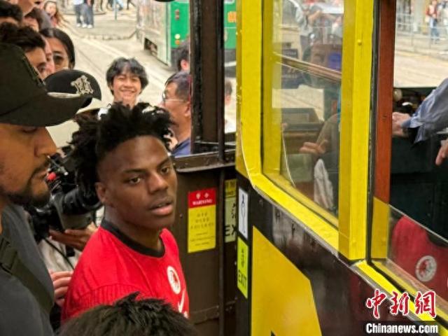 4月4日,美国网红IShowSpeed(中文昵称为“甲亢哥”)开启香港行,到访时代广场、香港海洋公园等地,并到茶餐厅用餐、乘坐电车游览香港景色,引起香港市民关注。图为“甲亢哥”(红衣)准备登上电车。 中新社记者 李志华 摄