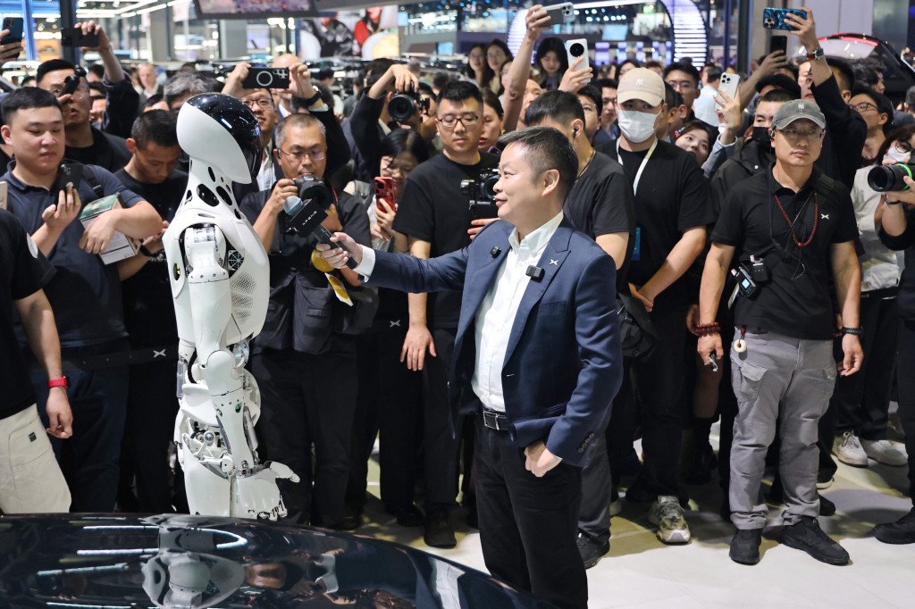 小鹏汽车董事长何小鹏与机器人IRON互动。