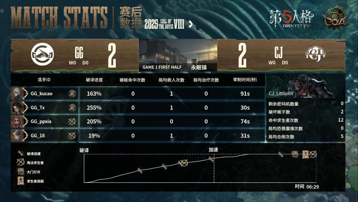 成都GG的求生者选择了木偶师、入殓师、祭司、守墓人;CJ的监管者LittlieRR选择了“跛脚羊”。(BAN机械师、大副、先知、“心理学家”)
