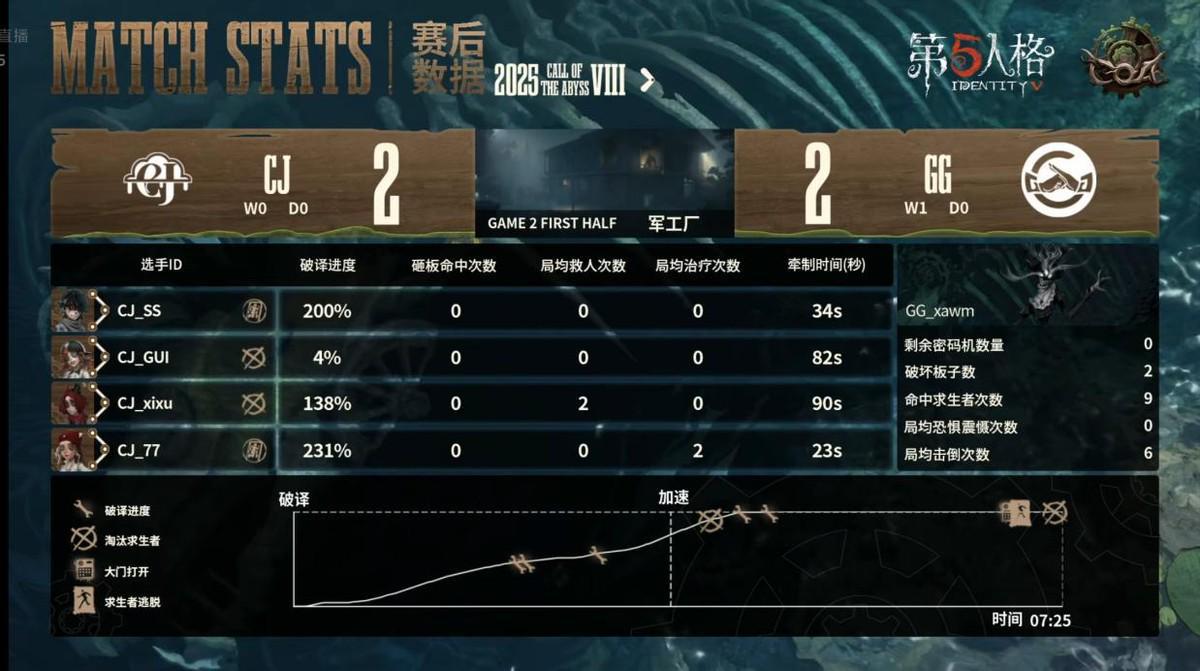 2025年3月7日,第五人格COA8中国大陆赛区预选赛第二日的比赛开始,在当天的比赛中,成都GG以2胜0平0负的战绩(14:4)击败了CJ,以下是本场比赛战报。