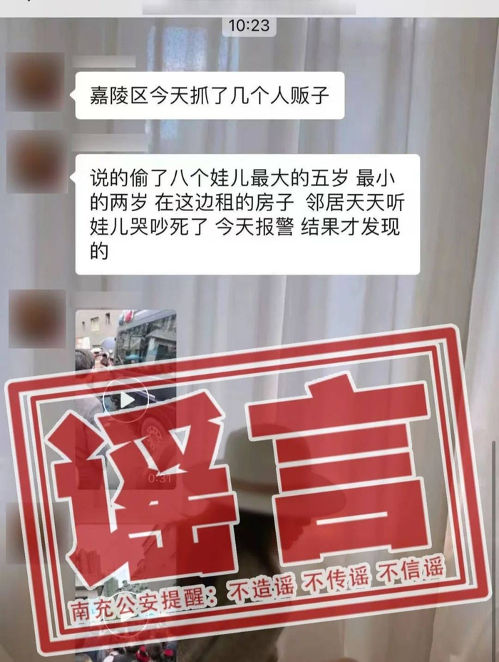 因此,各大自媒体平台流传的“南充警方抓获一人贩子引围观”“嘉陵区抓到人贩子团伙”等情况均系谣言。