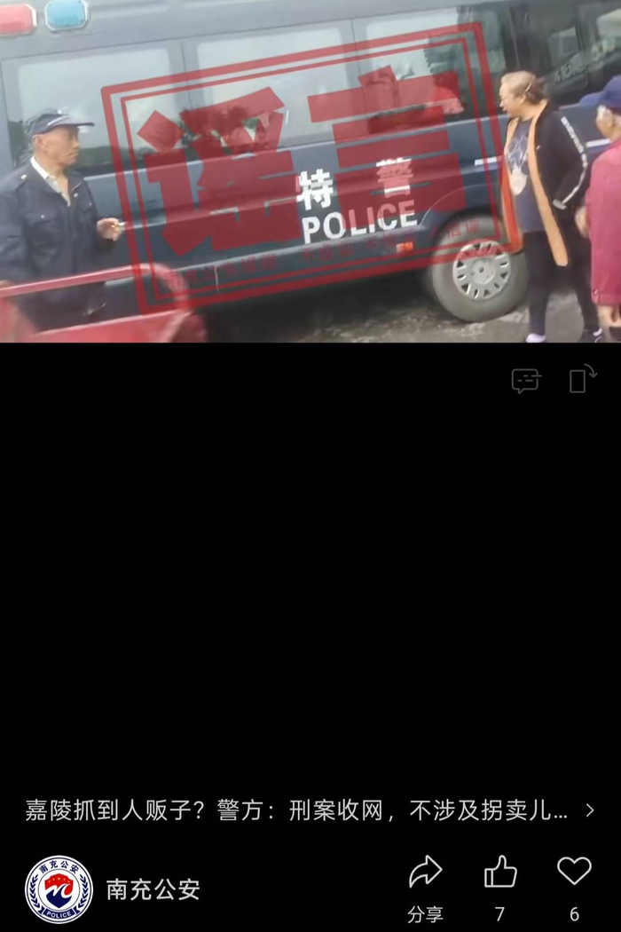 △网传四川南充嘉陵区抓到人贩子为谣言。(图据南充公安)因案件目前还在进一步侦办之中,根据相关法律法规,警方暂时无法向大家透露更多具体情况。