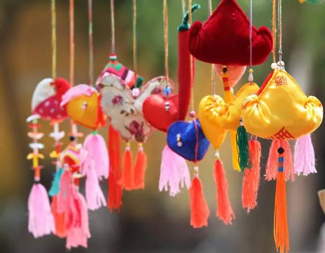 香囊内有朱砂、雄黄、香药,外包以丝布,清香四溢,再以五色丝线弦扣成索,作各种不同形状,结成一串,形形色色,玲珑可爱。