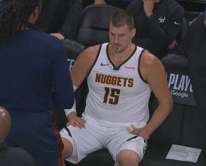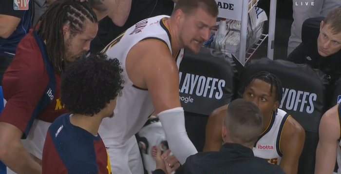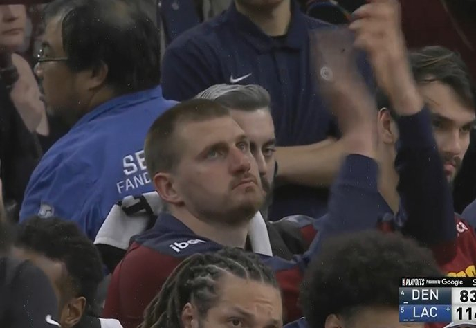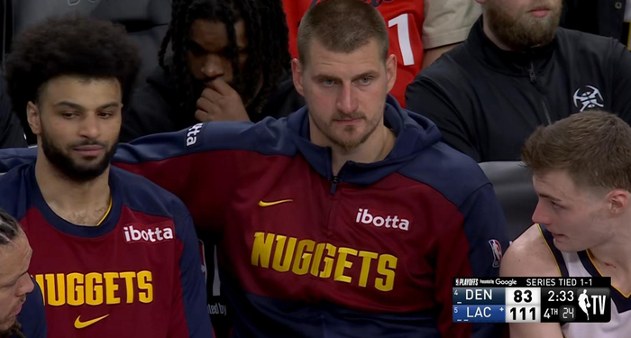 后面约基奇自己赌气坐那儿,也不知道在想些什么,但是看他的面部表情就能够看出他确实很无语。快船队动不动就三四个人包夹他,然后他把球传出去,发现一圈都是“拒投”,每一个人都不会投三分,连个射手都没有,约老师气得感觉破防了。