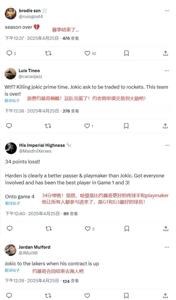 看到这个场面,大批的掘金球迷,尤其是美国那边的掘金球迷都无语了。他们跑到球队官方社交媒体下面留言说:“要不约老师申请交易到火箭队吧,这个球队就是在浪费你的巅峰了。”、“约基奇在合同结束之后可以考虑去湖人,辅佐詹姆斯再拿一冠。”、“去金州勇士,库里是你最好的选择。”
