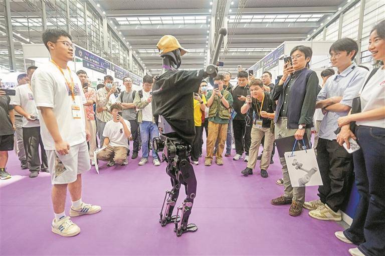 “这是赢得马拉松冠军的那个机器人吗?”“我来跟冠军合个影!”“这是它的兄弟‘天工’,性能也很强。”一大早,优必选展位前就围满了观众,就为一睹人形机器人“天工”的风采。
