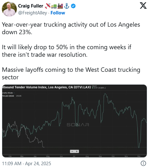 对此,美国很有名的物流行业平台FreightWaves首席执行官Craig Fuller在X上发帖警告称: