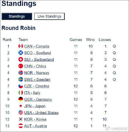 2025男子冰壶世锦赛循环赛,中国队在倒数第二场比赛中10-1大胜韩国队,取得7胜4负的战绩。由于瑞士6-5战胜捷克,6支出线球队已经全部产生,分别是加拿大、苏格兰、瑞士、中国、挪威和瑞典。 来源:央视体育返回搜狐,查看更多