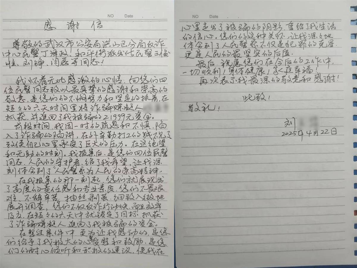 近日,广东珠海刘婆婆的心情就像是坐了趟“过山车”。她那准备用于手术的2.2万元积蓄,差点就被电信网络诈骗分子席卷而空。所幸湖北武汉洪山警方迅速响应上级下发的线索,一小时内落地嫌疑人身份,赶往孝感大悟县,将5名为电信网络诈骗犯罪提供语音中转服务的犯罪嫌疑人抓获,及时追回“救命款”。事后,老人饱含深情,写下一封长文感谢信,向洪山警方表达诚挚谢意。