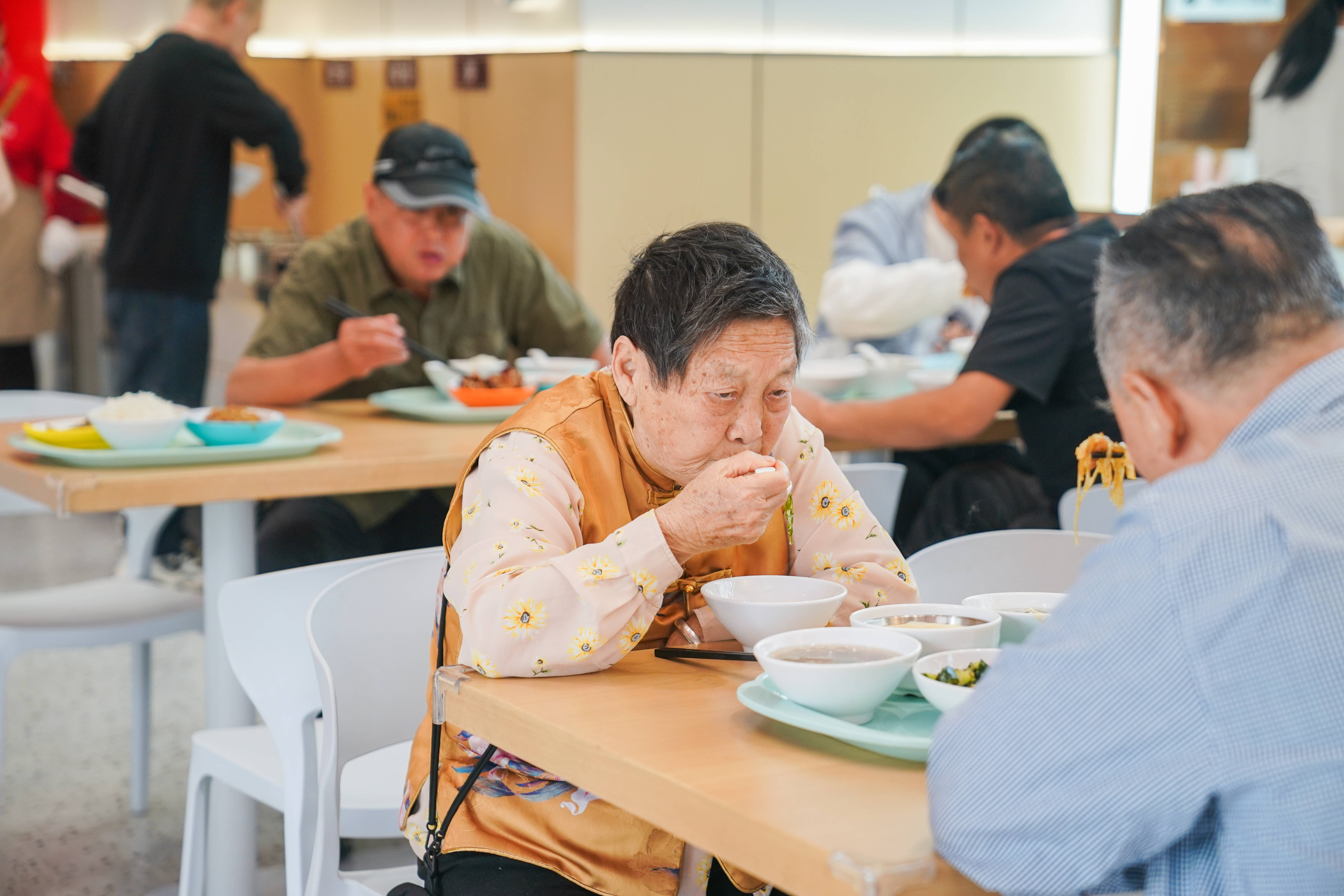 上午十一点刚过,家住盘龙城天汇龙城附近的老人们早早来到社区幸福食堂就餐,这里菜品丰富,对于65周岁以上的老人每月可享受100元的餐食补贴,并且为行动不便的老人和特殊群体免费提供爱心送餐服务。