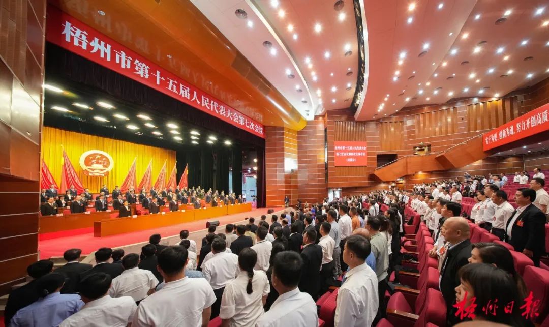 4月29日,梧州市十五届人大七次会议圆满完成各项议程,在市文化展览中心胜利闭幕。