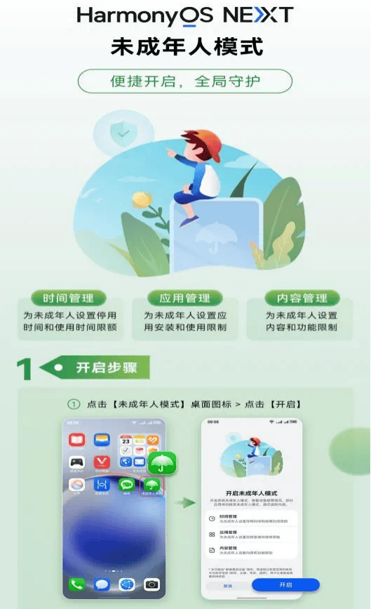 从覆盖范围看,华为、OPPO和中兴在手机系统更新后提供未成年人模式,小米、荣耀和vivo在发布的新机上搭载未成年人模式,应用商店建立未成年人专区,短视频、社交、电商、教育、工具等领域重点应用程序全面升级未成年人模式。后续模式的覆盖范围还将持续扩大,满足未成年人日常使用需求、提供丰富多元服务。