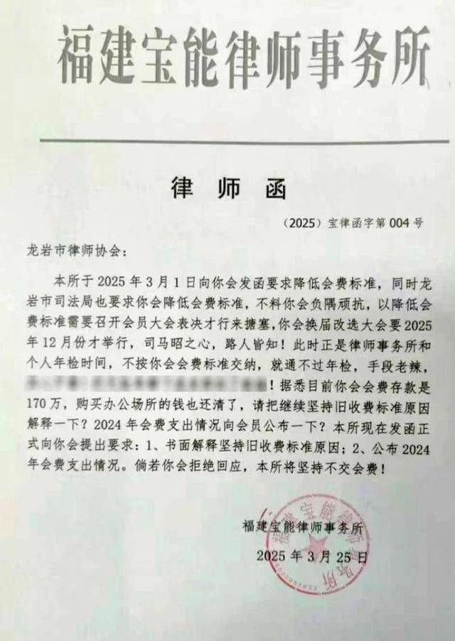 4月29日,大皖新闻记者调查发现,这并非是福建宝能律师事务所首次“硬刚”律协,2024年7月1日,该律所就曾给龙岩市律协发律师函称,该协会多年来资金未接受审计,会员不清楚资金用途,该律所未享受会员利益,要求律协公开2016年至2023年会费支出用途,并将财务审计报告向会员公开,否则将依法起诉讨回会费。该律师函曝光后,曾引发广泛关注。