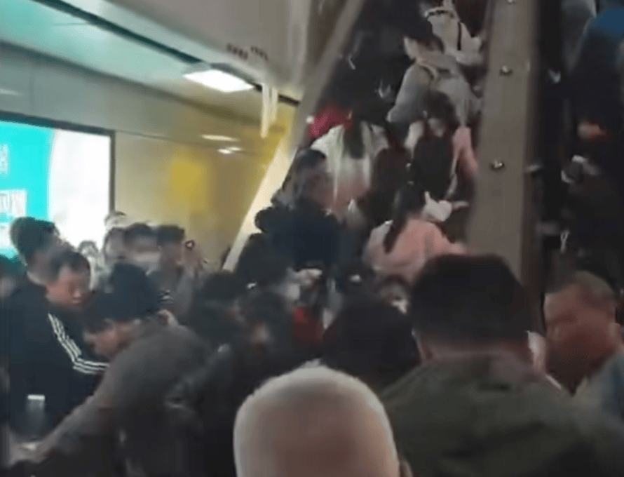视频显示,深圳北站地铁站内挤满乘客。在其扶梯处,有上行乘客挤到下行的扶梯,强行往上走,但因拥挤乘客过多,上行与下行的乘客在扶梯入口处碰撞摔倒,现场混乱。视频中随后出现身穿红马甲的工作人员来到前方疏导秩序。