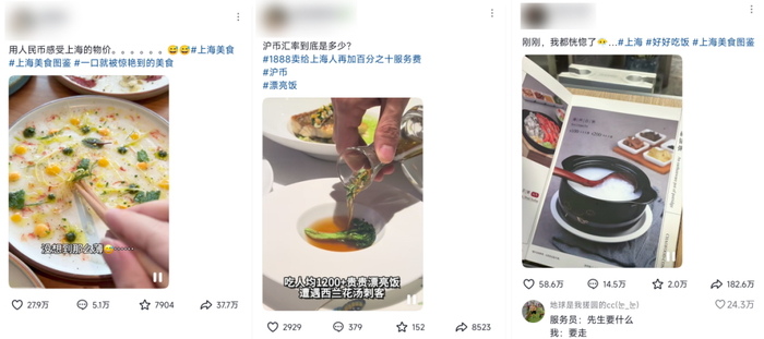 图为:上海的那些“高价漂亮饭”图源:抖音用户@周思诺、@爱吃酸黄瓜、@法拉小姐