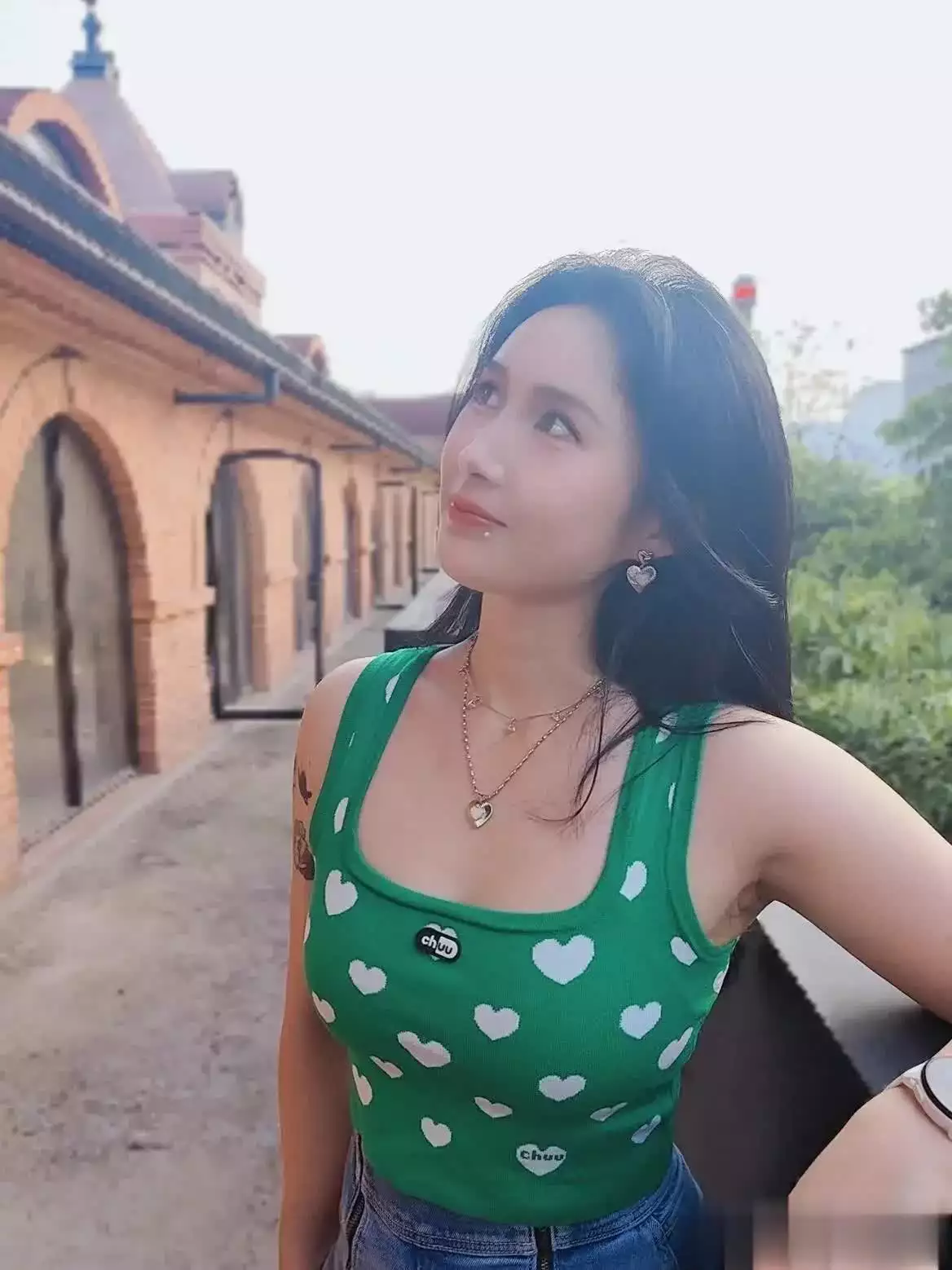照片中的女性,身着绿色背心与牛仔裤,简约而不失时尚感。项链与吊坠轻轻垂落,为她增添了几分柔美与精致。她的黑发如瀑,自然披散,更显得她温婉可人。最引人注目的,莫过于她那灿烂的笑容和直视镜头的眼神,仿佛在与每一位观者进行心灵的交流,传递着温暖与亲切。