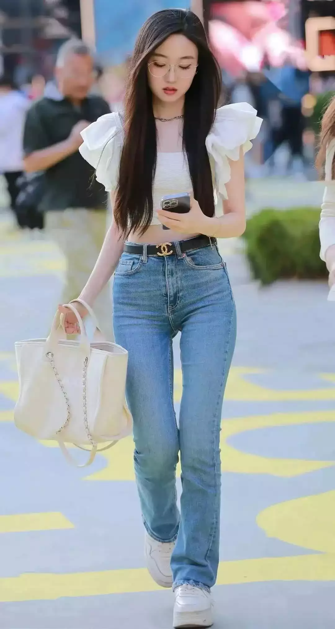 不论是在街边还是大学校园,她总能吸引所有目光。她的穿搭向世界展示了自己的个性与品味。白色T恤、牛仔裤和白色运动鞋的组合展现了她的时尚态度和年轻活力。手中的白包更是彰显了她的高雅与时尚品味。