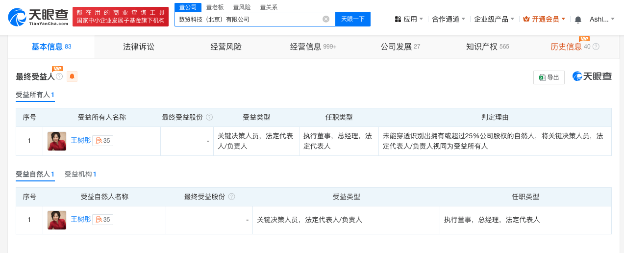天眼查App显示,敦煌网关联企业数贸科技(北京)有限公司成立于2018年1月,法定代表人为敦煌网创始人王树彤,注册资本为2720万美元,经营范围包括软件开发、通讯设备销售、电子产品销售、计算机软硬件及辅助设备零售、供应链管理服务等,由数字贸易(香港)有限公司全资持股,最终受益人为王树彤。
