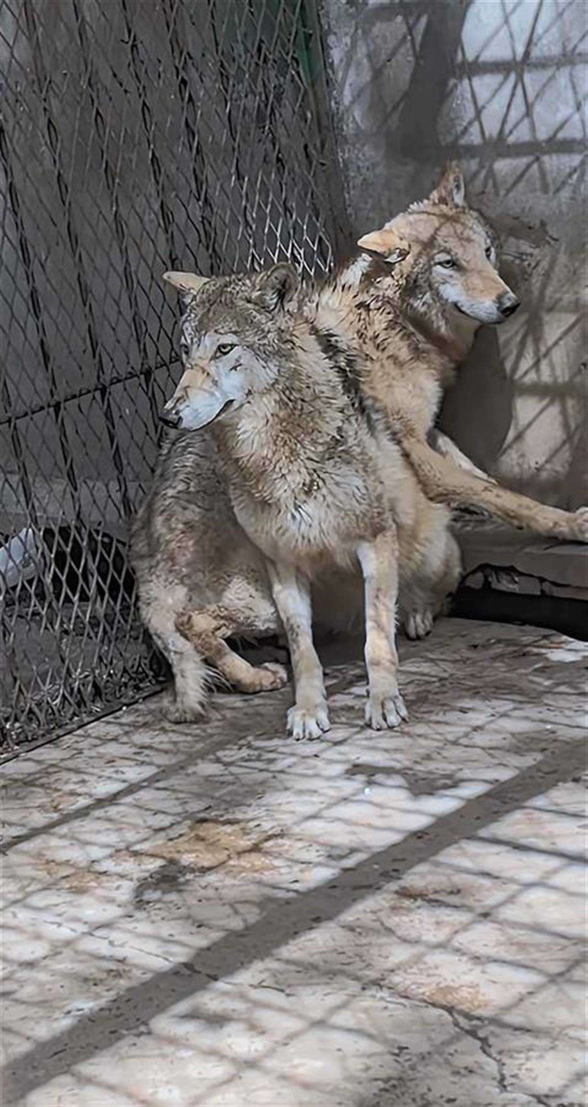 视频显示,饲养员进入狼圈后呼喊两只狼过来吃饭,不过,两只狼却蜷在角落发抖,目光不敢正视饲养员。