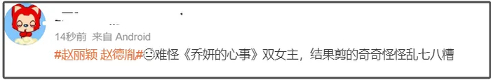 根据狗仔漫画爆料信息,赵丽颖与赵德胤是在剧组暗生情愫,赵德胤爱到完全不顾及其他演员的感受,明晃晃的偏爱赵丽颖。《乔妍的心事》是双女主戏份,上映后赵丽颖戏份明显偏多,如果狗仔爆料属实,导演这私心着实有些重,不怪恋情曝光后有网友感叹电影被剪得乱七八糟。