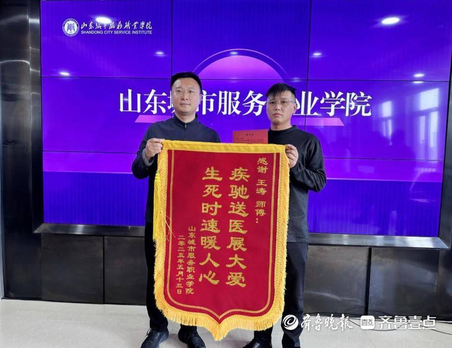 现场,校方将一面写有“疾驰送医展大爱,生死时速暖人心”的锦旗赠给救人司机王涛,同时为学生姜昭鹏颁发荣誉证书。