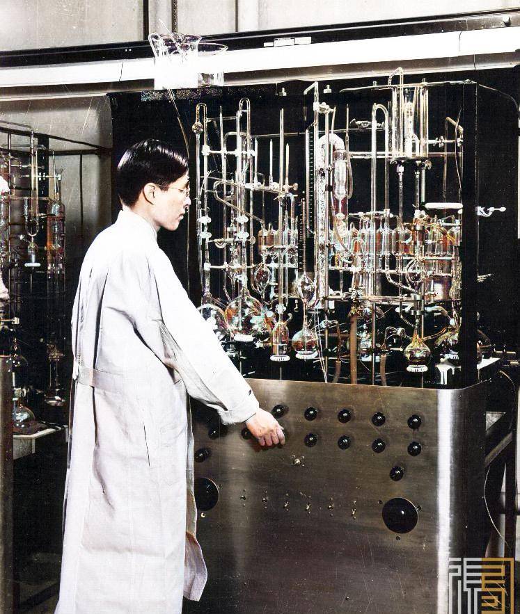 1950年 ,上海,气象局工作人员正在调试分析空气的机器。密密麻麻的试管看起来还挺复杂。