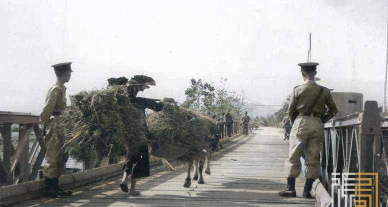 1950年,边界香港一侧,有行人牵牛担草通过一个木桥,这边值守人员身着英式服装,对面可见两名解放军战士相向而立。