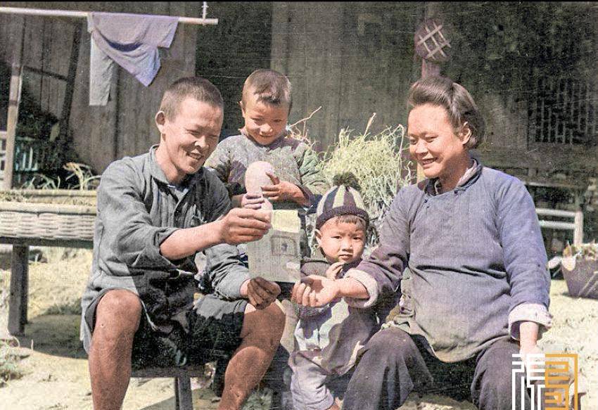 1950年,浙江嘉兴东乡,一位农民喜气洋洋地向母亲和两个孩子展示刚刚领到的土地证,此时的农村土地改革已经胜利完成。