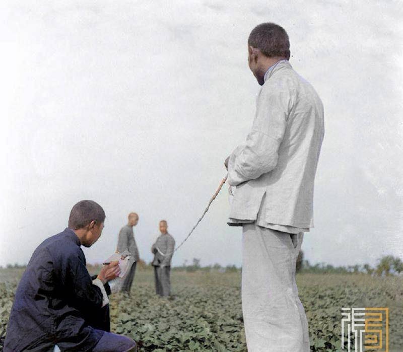 1950年9月,河南省洛阳专区洛阳县平乐区,土改期间,农民在棉花地里丈量,之后这些土地就按人口分到各家各户了。