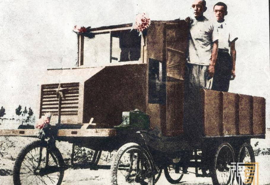 1950年,山东高唐县旧城乡铁木供应厂,两名男子向人们展示厂里生产的木制汽车上,这是一辆真实的汽车,用的是煤油机,六匹马力,就是不知乘坐感受如何。