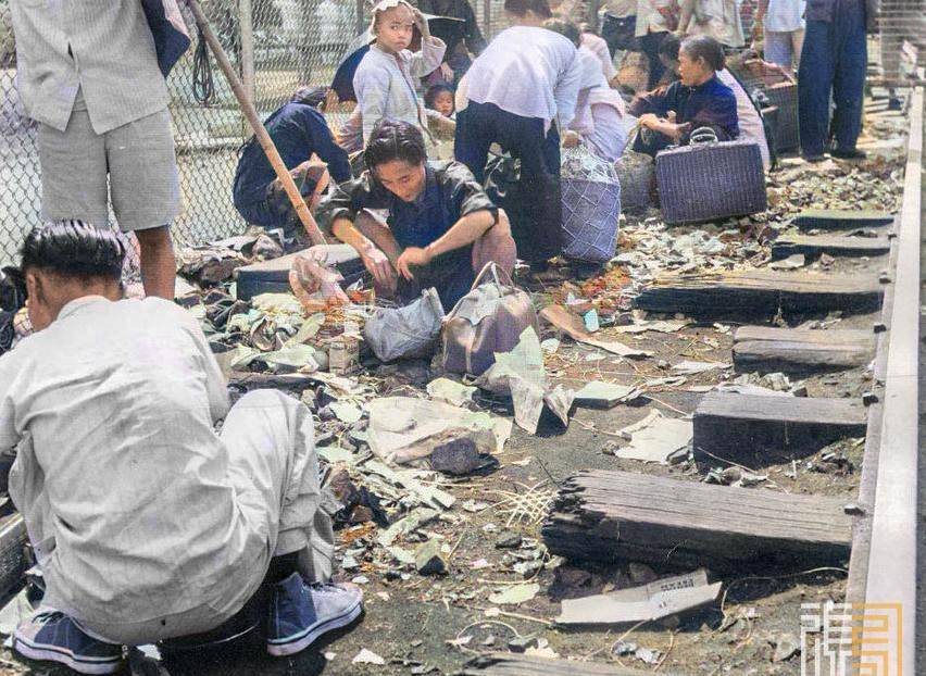 1950年,中港边界,一群正在等待通关的人们,老旧的铁轨,杂乱的地面,左侧男子的一双鞋倒挺新潮。