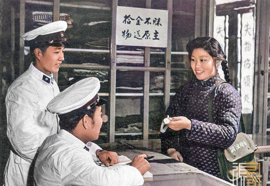 1950年,湖北武汉,失物招领处,一名美女将一块儿捡到的手表交到工作人员手中,身上挎包有“武汉电车”字样,这个拾金不昧的美女应该是一名电车司机或售票员
