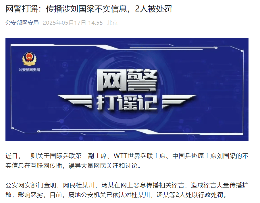 5月17日,据公安部网安局:近日,一则关于国际乒联第一副主席、WTT世界乒联主席、中国乒协原主席刘国梁的不实信息在互联网传播,误导大量网民关注和讨论。