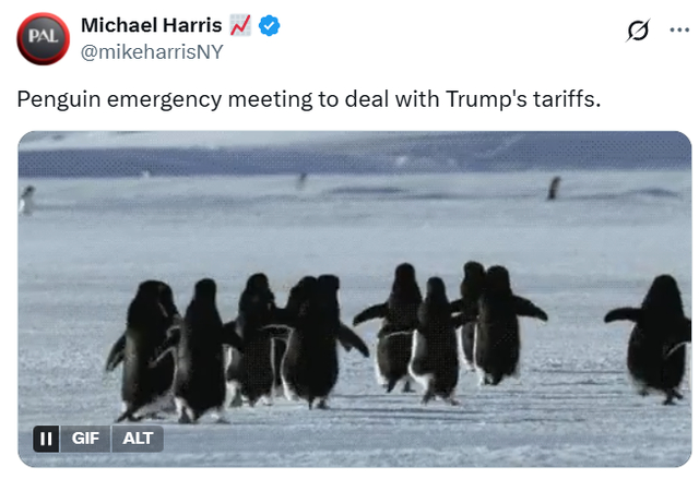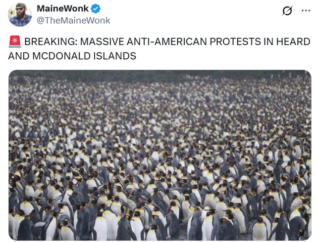 社交媒体截图帖文翻译:突发新闻——一群企鹅前往白宫,抗议特朗普关税2
