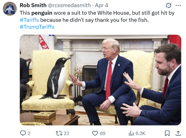 社交媒体截图帖文翻译:这只企鹅穿着西装去了白宫,但仍被征收关税,因为它没有说谢谢你的鱼。梗图背景:此图借用2月28日乌克兰总统泽连斯基在白宫同特朗普会谈。泽连斯基未穿西装,并与特朗普和美国副总统万斯发生争吵。美方指责泽连斯基无礼,缺少感恩之心。