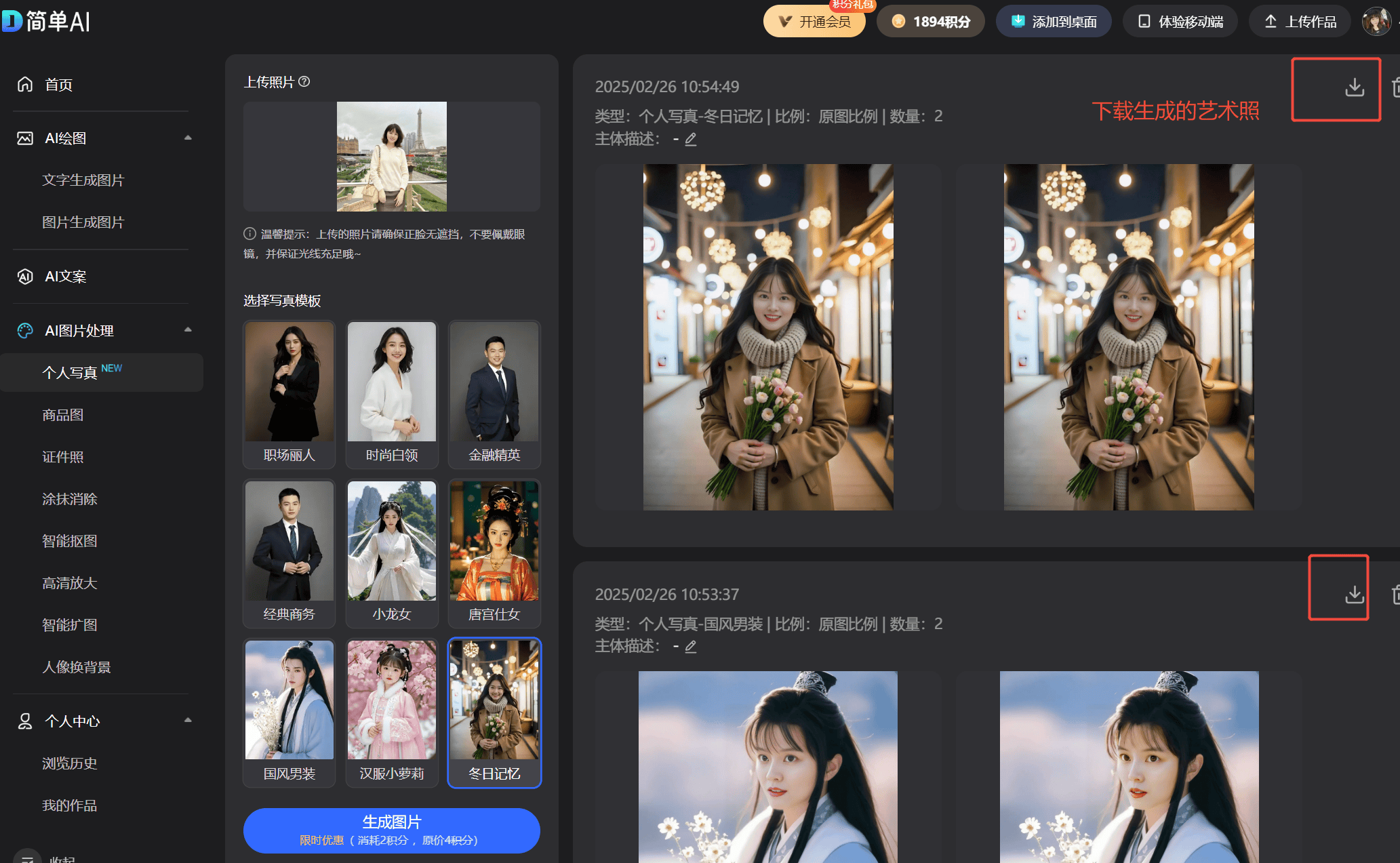 第三步:点击右上角下载生成的艺术照