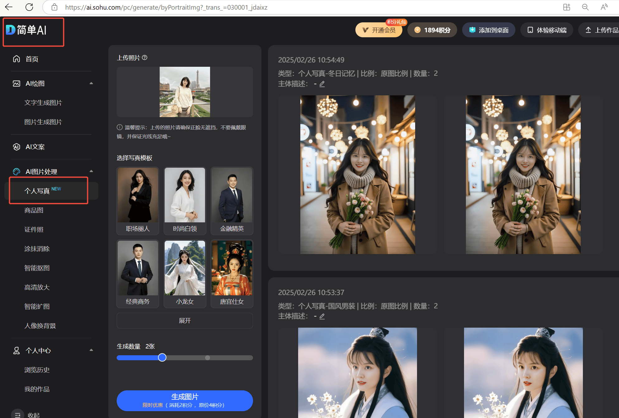 但美中不足的是,每次都需要用户上传多张参考图,且等待很长时间才能生成,比如妙鸭需要上传20张图就很令人崩溃。今天我就来分享一个更简单便捷的AI艺术写真工具——搜狐简单AI的【艺术写真】工具,只需上传一张照片,即可生成不同风格的艺术写真/职业照,且20秒快速出图。工具指路:https://ai.sohu.com/pc/generate/byPortraitImg?_trans_=030001_jdaixz