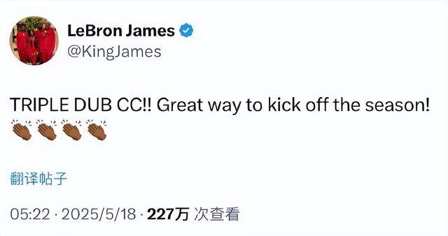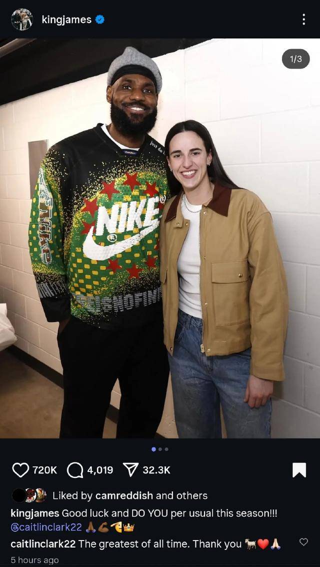 克拉克赛后与詹姆斯拥抱合影,且詹姆斯还通过社媒写道:“克拉克达成三双,很棒的赛季开局表现。”克拉克则是回应:史上最伟大的球员,谢谢你。