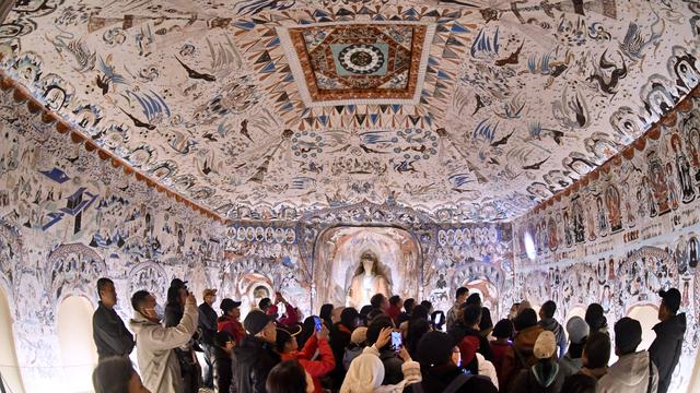3月29日,观众在参观“如是莫高”敦煌艺术大展中展出的莫高窟第285窟的复刻版本。